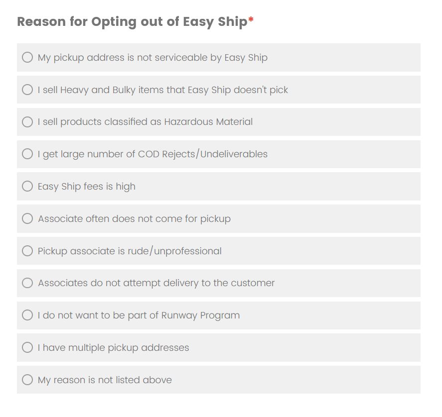 Reason for opting out of Easy Ship (Choose the most relevant reason from the options provided in the form).